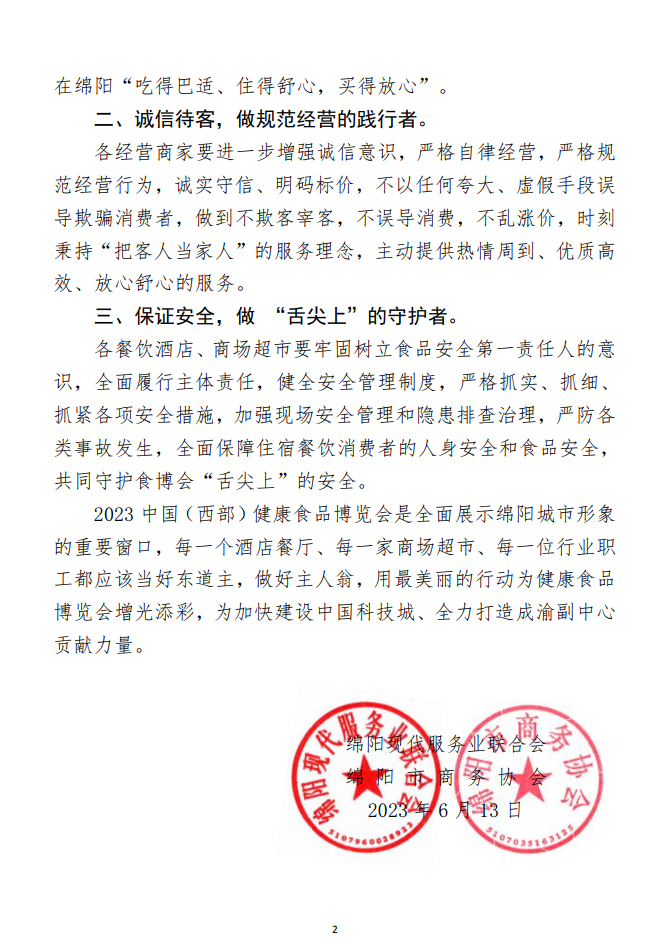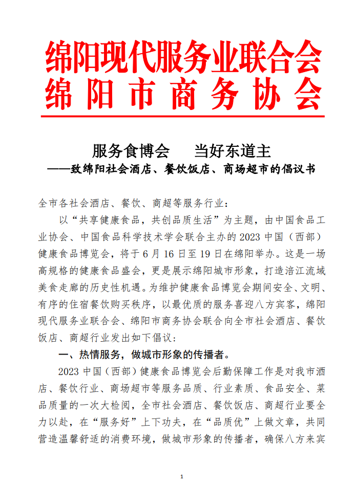 服务食博会,当好东道主--致绵阳社会酒店、餐饮饭店、商场超市的倡议书