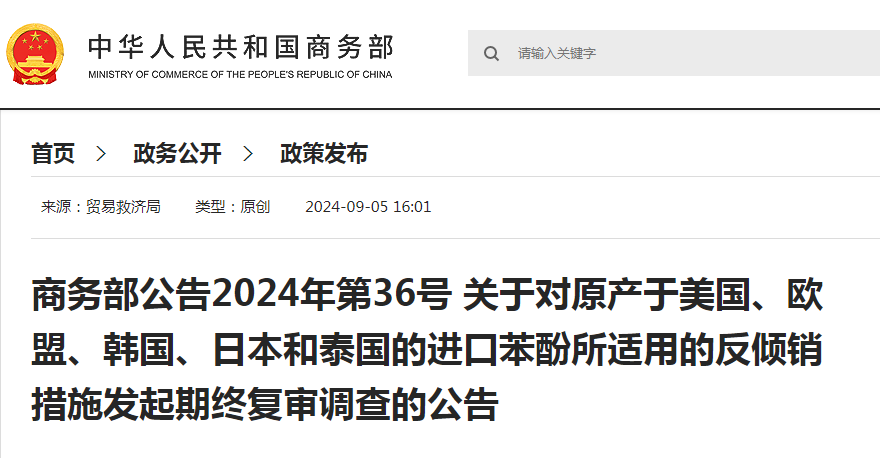 根据《中华人民共和国反倾销条例》第四十八条规定,商务部决定自2024年9月6日起,对原产于美国、欧盟、韩国、日本和泰国的进口苯酚所适用的反倾销措施进行期终复审调查。现将有关事项公告如下: