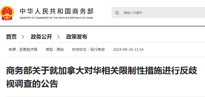 依据《中华人民共和国对外贸易法》第三十六条、第三十七条规定,商务部决定自2024年9月26日起对加拿大相关被调查措施启动反歧视调查。现将有关事项公告如下: