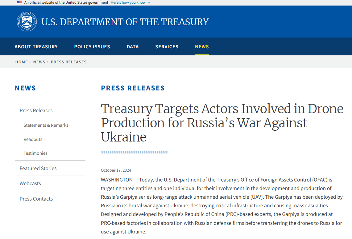 当地时间10月17日,美国财政部宣布对中国两家公司实施制裁,指控其与俄罗斯的军事技术合作有关。