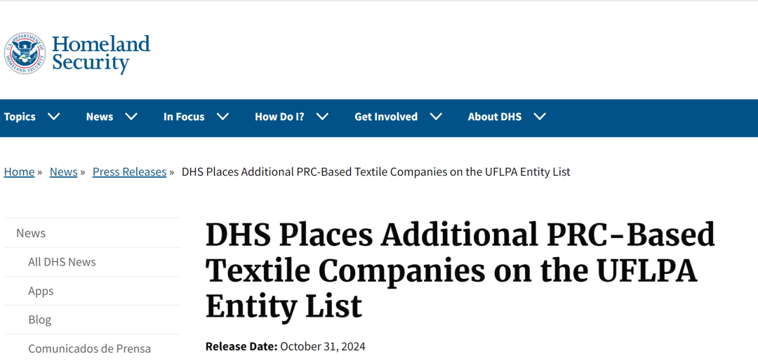 2024年10月31日,美国国土安全部更新了UFLPA实体名单,将纺织公司纳入其中,并自2024年11月1日起实施。