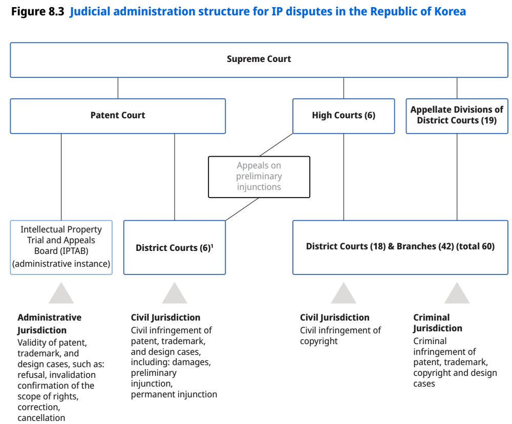涉及专利、商标和外观设计的刑事诉讼一审由犯罪行为所在地或被告所在地的地方法院受理,韩国的18个地方法院及其分支机构均对知识产权的刑事诉讼享有管辖权,由独任法官审理。对地方法院做出的刑事一审判决不服的,可以上诉至最高法院。下图对韩国IPTAB和三级法院构成的知识产权审理体系进行了总结。