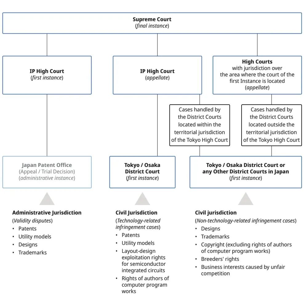 另一方面,日本的知识产权管理体系分为行政、司法和执法三个分支,行政主要负责权利的授予和授权后审查,司法主要受理知识产权的侵权诉讼,执法主要是海关和警察的职能。