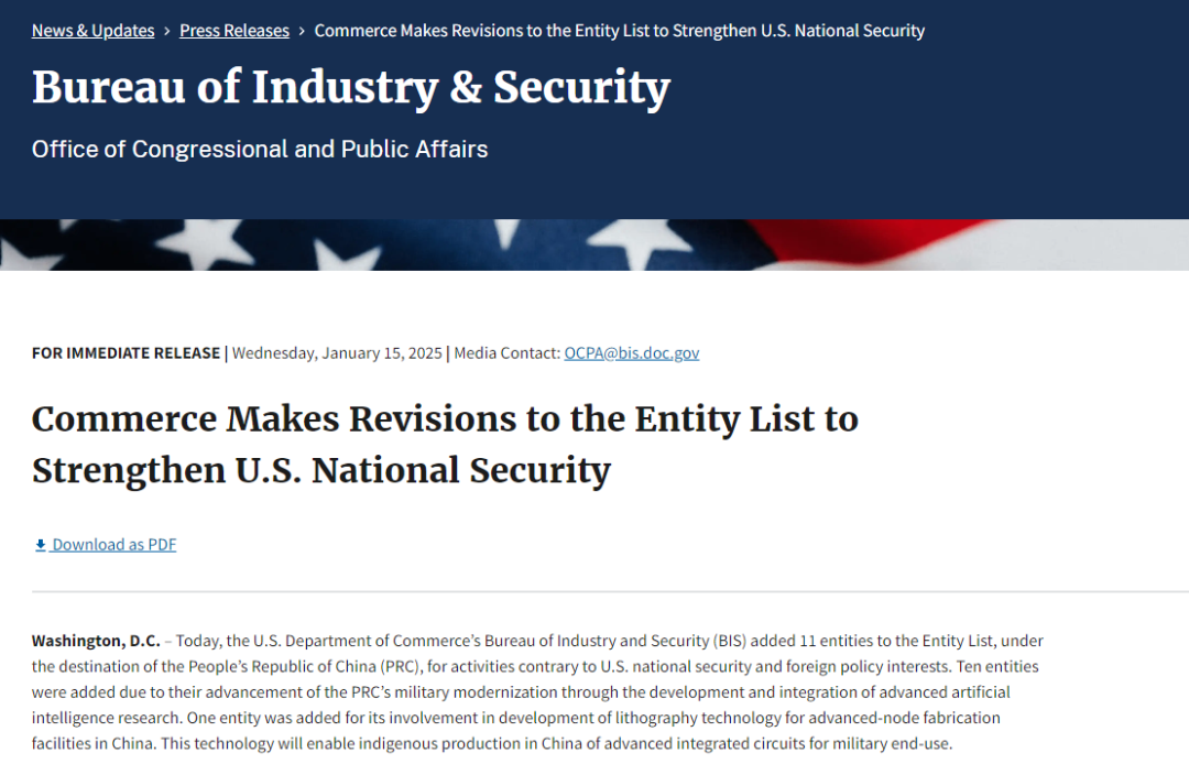 2025年1月15日,美国商务部在联邦纪事公布2个决定,新增出口管制实体清单实体27个,其中中国25个(上海2个)。其中,以涉及其国家安全和外交利益为由,新增中国14个实体;以涉军为由,新增11个中国实体,其中10个涉人工智能研究,另1个Beijing Keyi Hongyuan涉先进制程光刻机研究。