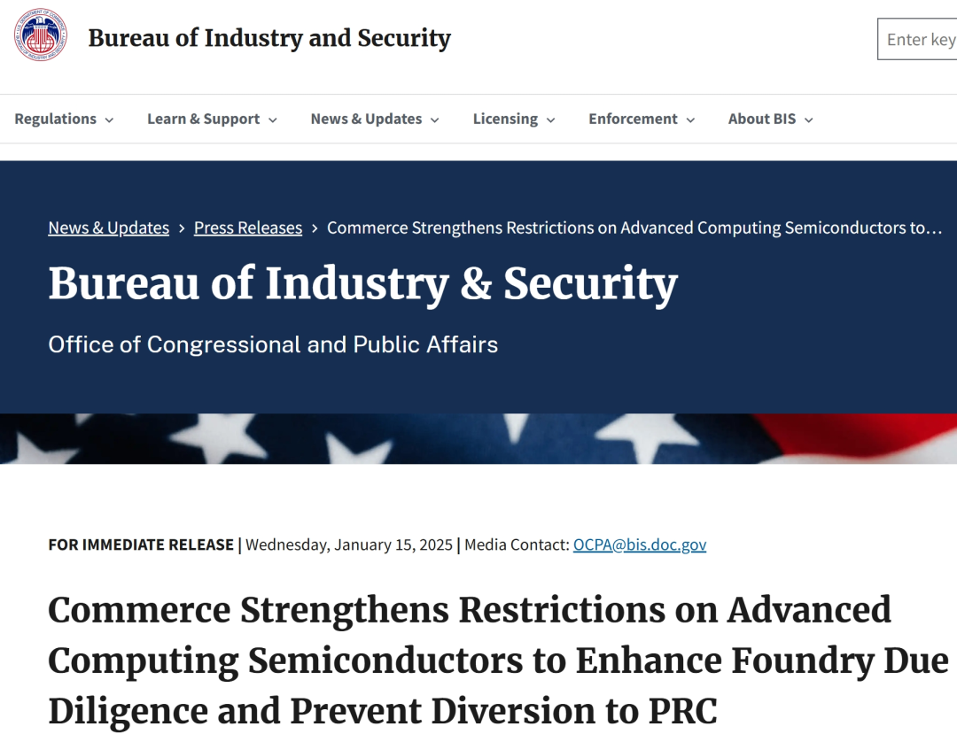 当地时间2025年1月15日,美国商务部工业和安全局(BIS)修订了《出口管制条例》(EAR),以回应公众要求,为先进计算集成电路(IC)提供额外的尽职调查程序。据称该临时最终规则(IFR)将保护美国的国家安全,并帮助代工厂和外包半导体组装和测试(OSAT)公司遵守EAR中有关供应链中先进计算IC的规定。本IFR还修订了EAR,对BIS于2024年12月2日发布的《外国生产的直接产品规则的补充和先进计算和半导体制造物品控制的细化》(FDP IFR)所做的修改进行了修订和澄清,包括将FDP IFR的书面评论截止日期延长至2025年3月14日。