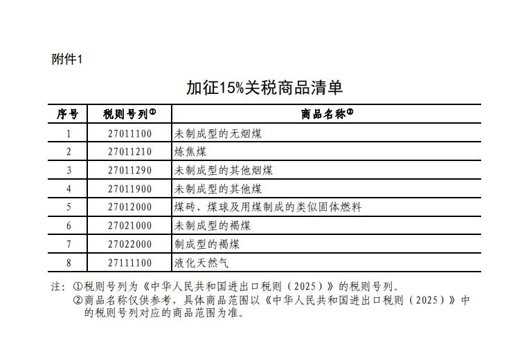 一、对煤炭、液化天然气加征15%关税,具体商品范围见附件1。