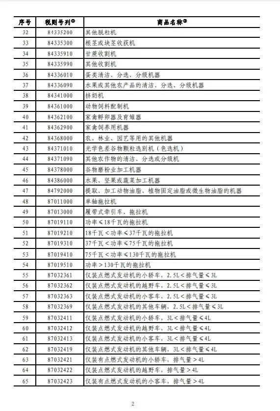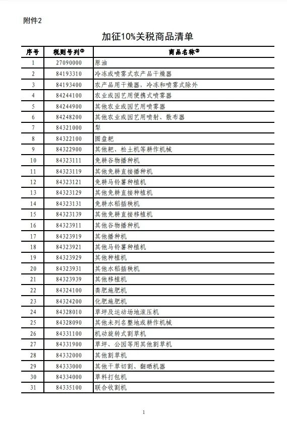 二、对原油、农业机械、大排量汽车、皮卡加征10%关税,具体商品范围见附件2。