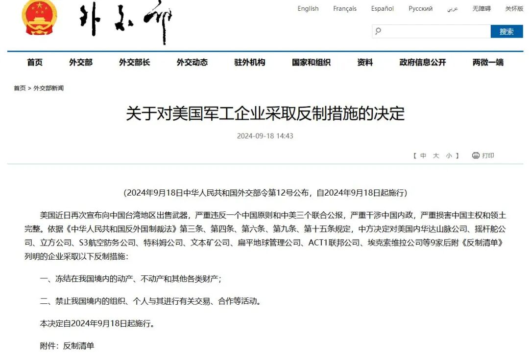 9月18日,外交部发布《关于对美国军工企业采取反制措施的决定》,全文如下: