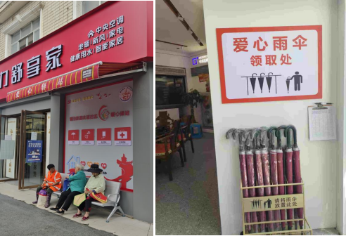 走进面积不大的店铺,暖心设施特别醒目:门口有“爱心雨伞”领取处,中间有“免费充电”处。为了方便新就业群体和户外工作者,店里还配备了冷暖饮用水、多接口智能充电设备、应急医药箱等设施一应俱全,为工作在高温一线的环卫工人、快递小哥、外卖骑手等户外工作者撑起了一片“绿荫”,解决他们“饮水难、歇脚难、充电难、应急难”的实际问题。“爱心驿站”门口还特设了休息长椅,为户外工作者和过往居民提供了一个临时歇脚的温馨角落。
