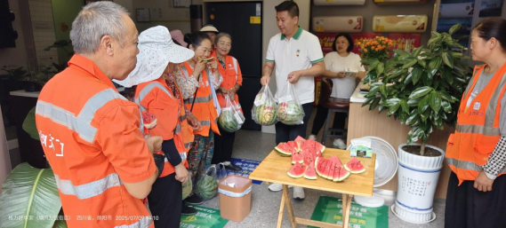当天,骄阳似火,烈日炎炎。吴文国为13名环卫工作者送上了100多斤大西瓜和26盒藿香正气液等解暑物品,得到了环卫工人的称赞。