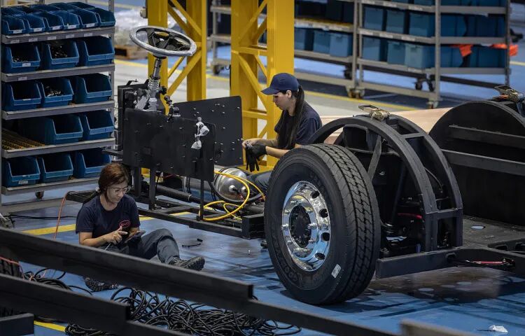 巴西圣保罗州,当地员工在中国车企的生产流水线上组装电动巴士底盘。(视觉中国)