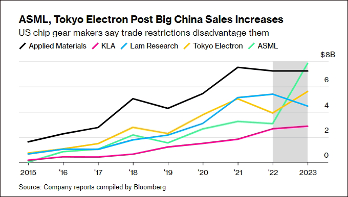 东京电子和ASML近年来对华出口额增加 彭博社制图