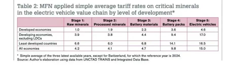 随着全球主要经济体纷纷将应对气候变化和减排纳入立法,向清洁能源技术和电动汽车(EV)转型的势头日益强劲。然而,世贸组织(WTO)和联合国贸发组织(UNCTAD)在最新的一项大数据研究之中发现,电动汽车生产链中不断升级的关税可能是阻碍发展中经济体实现出口多样化和提升价值链的一个因素。清洁能源技术严重依赖各种矿产。举例而言,太阳能发电广泛使用铜、铝、镉、碲和硒,而风力发电则需要铜、稀土元素、铬、锌和铝。电动汽车及其电池的生产需要铝、铜、钴、石墨、镍、锂、锰和稀土元素。前述WTO和UNCTAD的联合研究发现,由于全球向清洁能源技术和电动汽车的转变,对某些关键矿物(如钴、石墨和锂)的需求预计将大幅增长。据预测,到2050年,对这些矿物的需求将增加五倍。以生产电动汽车最需要的钴、石墨和锂而言,整体的价值链包括五个阶段:原矿开采、矿物加工、电池电极生产、电池制造和电动汽车生产。而在这一价值链的每个阶段都会出现关键矿物的贸易流动。在原矿开采方面,可以看到世界上近四分之三的钴是在刚果民主共和国开采的。中国是最大的石墨生产国,其次是莫桑比克、马达加斯加和巴西。智利则拥有世界上最大的锂储量,超过全球已知储量的三分之一。澳大利亚的锂储量位居第二,占全球锂储量的五分之一。随后的加工通常需要耗费大量能源和水资源,而将矿石提炼,将其进一步提炼成更纯净的电池级材料也需要耗费大量能源和复杂的化学工艺。因而对于大多数矿物来说,加工和提炼活动都集中在相对较少的几个地方。此外,WTO和UNCTAD在研究中谈到,“制造电池组件和开发电池单元也是研究密集型活动。这是一个充满活力的领域,预计在不久的将来会有技术革新。”而开采、提炼和加工往往远离最终产品的主要消费市场。因此,“任何一个经济体都不可能完成与电动汽车生产相关的所有工作。矿石或含有矿石的产品需要跨越国界,使国际贸易成为向清洁能源过渡的重要工具。开采、提炼和消费的广泛地理分布强调了国际贸易对电动汽车供应链的重要性。”WTO和UNCTAD认为。在产品流动时,就需要面临关税问题。电动汽车价值链相关产品的关税在不同加工阶段和不同经济体之间会有所不同。一般来说,电池组和电动汽车的关税要比原矿和电池矿产的关税高得多,而且在价值链的上游有明显的关税升级模式。