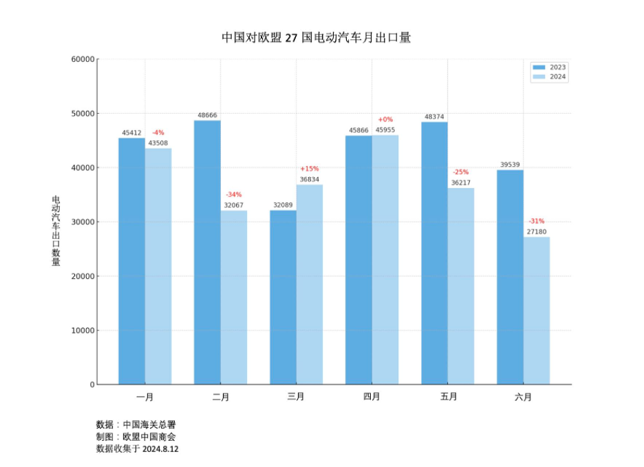 然而,欧盟的反补贴调查对中国向欧盟出口纯电动汽车(BEV)带来了显著的负面影响。根据中国海关总署的数据,6月中国向欧盟出口电动汽车的数量为27180辆,较5月份的36217辆减少了约25%,与去年同期相比更是下降了约31%。