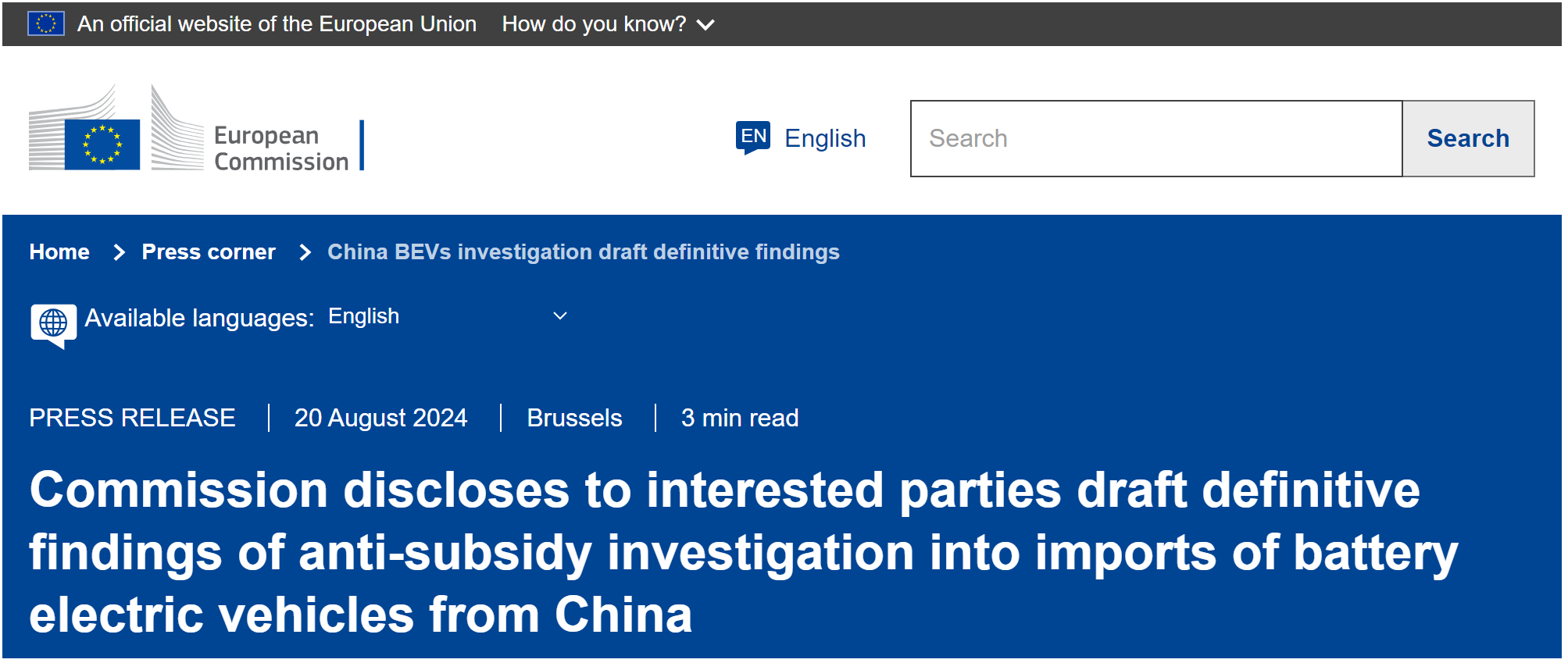 8月20日,商务部新闻发言人就此表示,中方多次指出,欧方对华电动汽车反补贴调查预设结论,在调查各环节的做法均违背其承诺的“客观、公正、非歧视、透明”原则,也不符合世贸组织规则,是以“公平竞争”为名行“不公平竞争”之实。