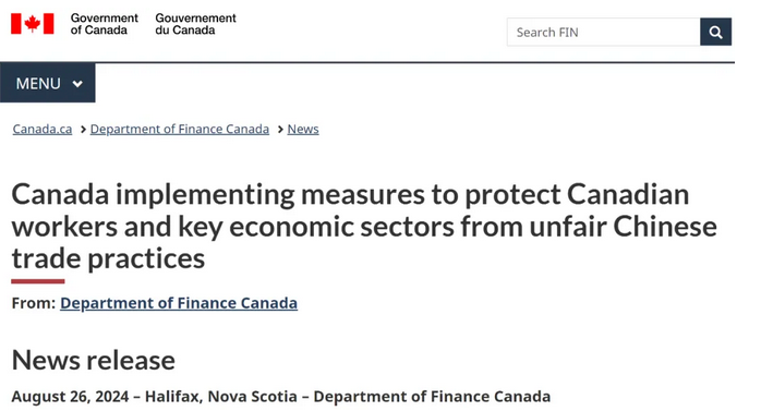 2024年8月26日,加拿大财政部宣布将对进口自中国的电动汽车、钢铁和铝征收高额关税。