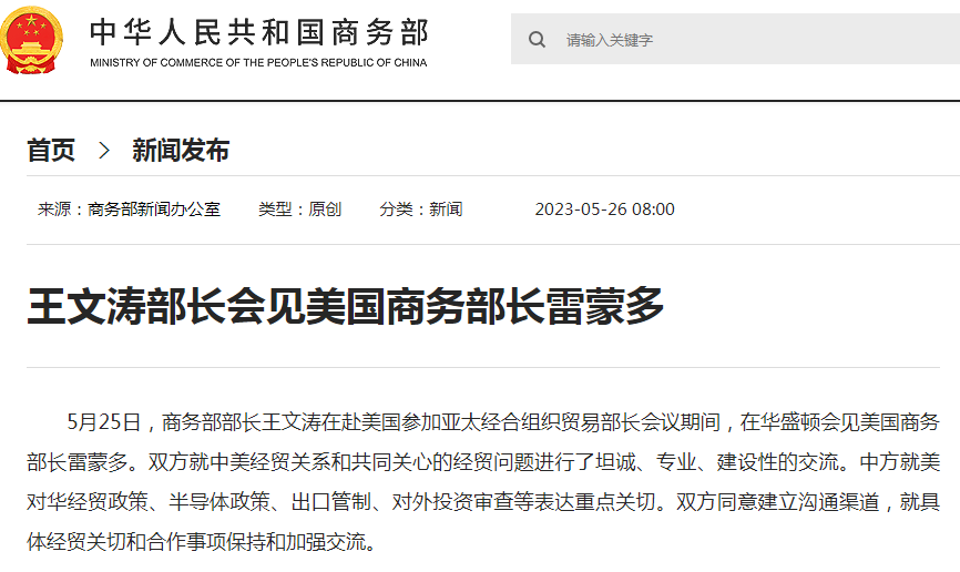 5月25日,商务部部长王文涛在赴美国参加亚太经合组织贸易部长会议期间,在华盛顿会见美国商务部长雷蒙多。双方就中美经贸关系和共同关心的经贸问题进行了坦诚、专业、建设性的交流。中方就美对华经贸政策、半导体政策、出口管制、对外投资审查等表达重点关切。双方同意建立沟通渠道,就具体经贸关切和合作事项保持和加强交流。