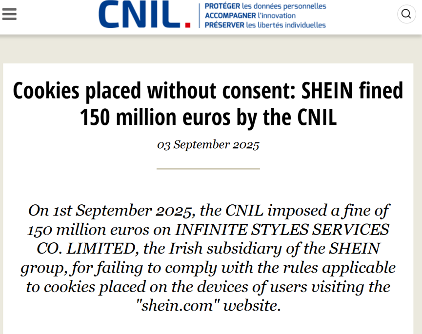根据法国数据保护监管机构(CNIL)官网9月3日宣布,该机构于9月1日对中国跨境快时尚电商巨头Shein集团旗下爱尔兰子公司 INFINITE STYLES SERVICES CO. LIMITED处以1.5亿欧元(约合1.76亿美元)的罚款。处罚原因是其在网站和应用程序中违规设置Cookies,并在未获得用户事先同意的情况下进行数据收集与追踪。