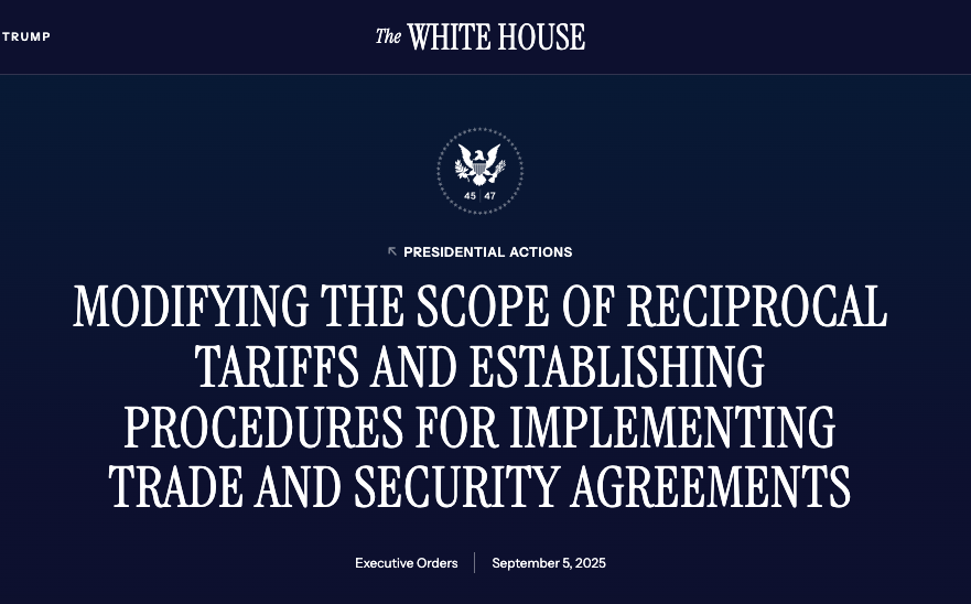 美东时间 9 月 5日,白宫发布特朗普行政命令《修改互惠关税范围及建立执行贸易与安全协议的程序》,特朗普修改对等关税适用范围,宣布对 39 种商品免征对等关税,新增 8 种商品加征对等关税。