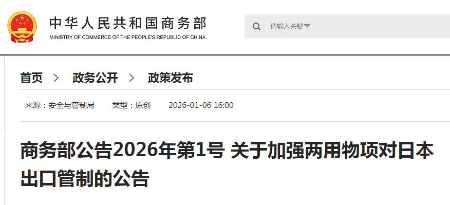 1月6日,商务部发布2026年第1号公告,关于加强两用物项对日本出口管制。