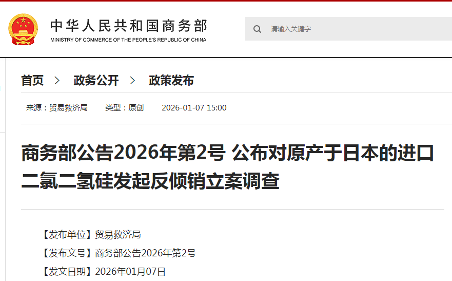 1月7日,商务部发布2026年第2号公告。依据《中华人民共和国反倾销条例》第十六条的规定,商务部决定自2026年1月7日起对原产于日本的进口二氯二氢硅进行反倾销立案调查。